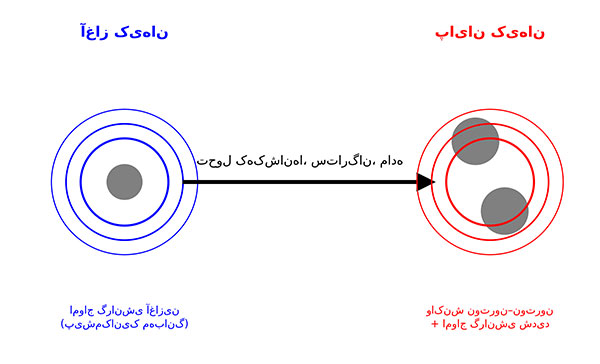 • آغاز جهان با رویداد موج گرانشی عظیم ناشی از واکنش‌های نوترون–نوترون نمایش داده شده.