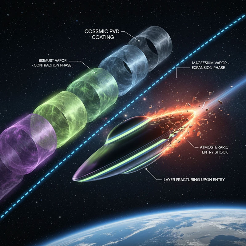 • این تصویر مسیر UAP را از میان نوارهای بخار فلزی بین‌ستاره‌ای نشان می‌دهد؛ هر نوار یک لایه جدید مثل PVD روی بدنه می‌نشاند. ورود به جوّ زمین شوک ایجاد می‌کند و لایه‌ها ترک می‌خورند و جدا می‌شوند.