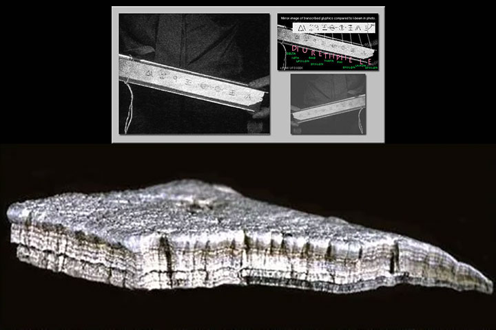 تصویر بالایی در عکس (حاوی نقوش و نشانه‌ها) بخش ادعایی دیگر همان پرونده است که مرتبط با کتیبهٔ روی بدنهٔ بشقاب است؛ اما بخش ارزشمند علمی همان تکهٔ فلزی پایین است.